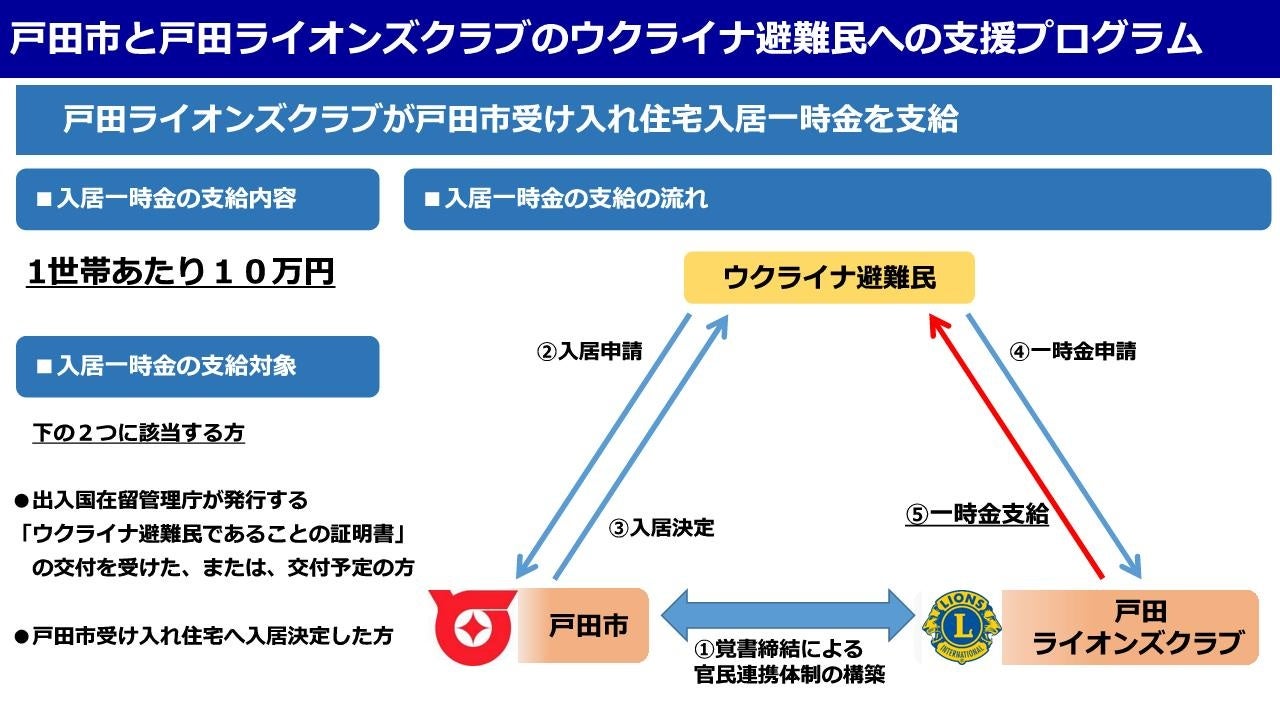 このような状況の中、戸田ライオンズクラブ(会長 萩原浩一様)から戸田市のウクライナ避難民への支援に協力の申し出があり、令和4年5月10日に覚書を締結し、受け入れ住宅入居時一時金(1世帯当たり10万円)を支給して頂くこととなりました。この覚書締結により、戸田市では、受け入れ住宅の入居決定から、日本財団による生活支援金(1人年間100万円)支給まで、切れ目のない支援が可能となりました。